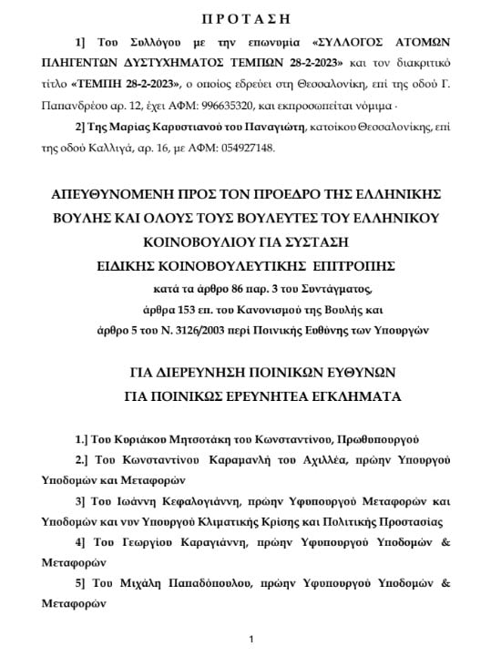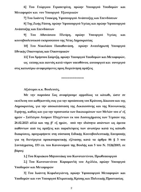 Η Μαρία Καρυστιανού ζητά να διερευνηθούν ποινικές ευθύνες του πρωθυπουργού Κυριάκου Μητσοτάκη, του πρώην υπουργού Υποδομών Κώστα Καραμανλή, του προκατόχου του Χρήστου Σπίρτζη, του πρώην υπουργού Υποδομών και υπουργού Εξωτερικών Γιώργου Γεραπετριτη, του πρώην υπουργού Υγείας και κοινοβουλευτικού εκπροσώπου της ΝΔ Αθανασίου Πλεύρη, του πρώην αναπληρωτή υπουργού Εθνικής Οικονομίας και Οικονομικών Νικόλαου Παπαθανάση, καθώς και πέντε υφυπουργών της κυβέρνησης της Νέας Δημοκρατίας (Κεφαλογιάννη, Τσακίρη, Καραγιάννη, Παπαδόπουλου και Ράπτη).