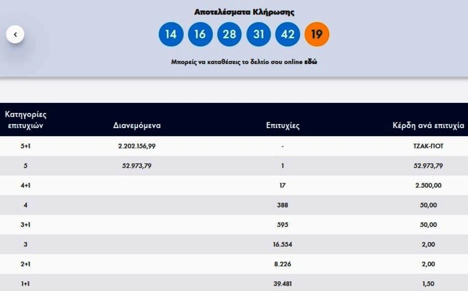 Σημειώθηκε ένα ακόμη τζακ ποτ στην πρώτη κύρια κατηγορία (5+1 επιτυχίες), ενώ στη δεύτερη κατηγορία (5 επιτυχίες) υπήρξε ένας και μοναδικός τυχερός, ο οποίος και θα λάβει 52.973,79 ευρώ.