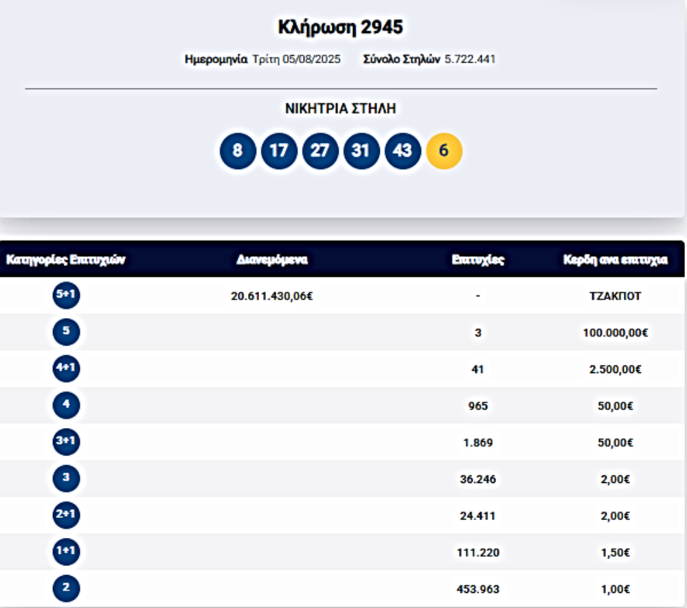 Νέο τζακ ποτ σημειώθηκε και απόψε στην πρώτη κατηγορία (5+1 νούμερα), ενώ αυτή τη φορά στη δεύτερη κατηγορία (5 νούμερα) βρέθηκαν τρεις τυχεροί, οι οποίοι κερδίζουν από 100.000 ευρώ.
