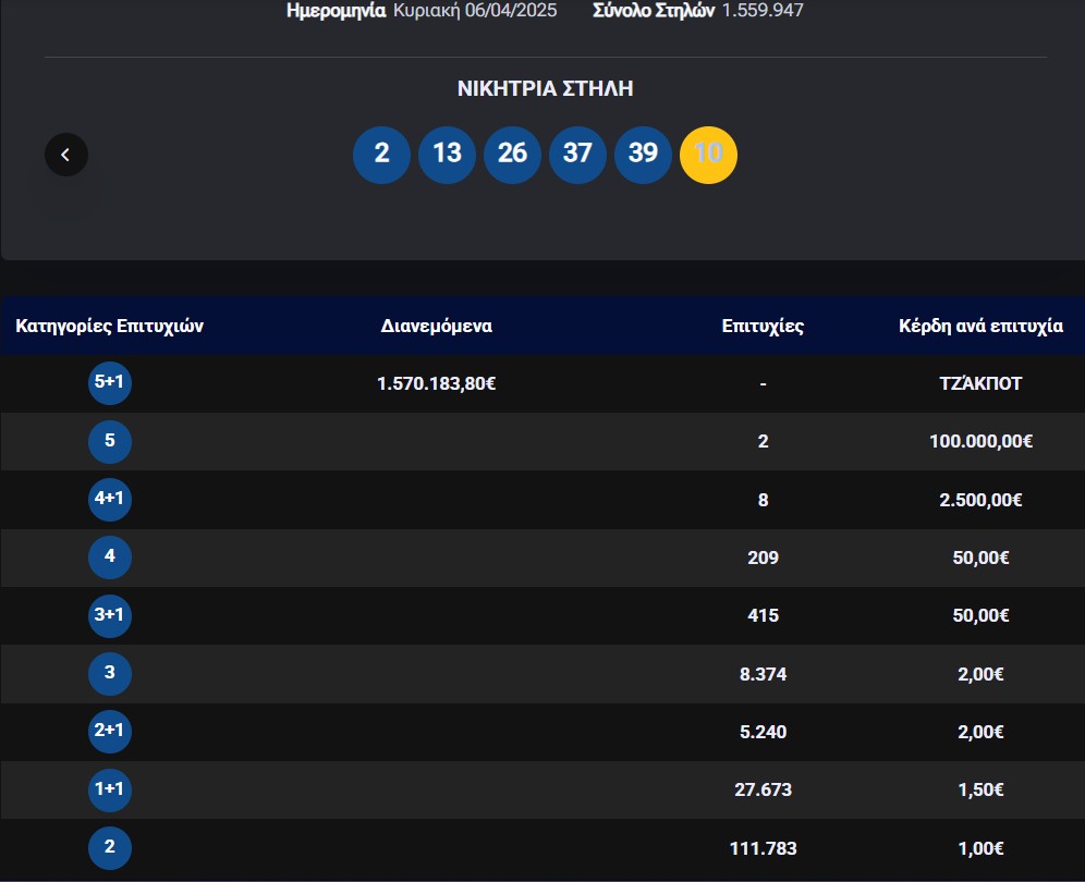 Νέο τζακ ποτ σημειώθηκε απόψε στην πρώτη κατηγορία (5+1 νούμερα), ενώ στη δεύτερη κατηγορία (5 νούμερα) βρέθηκαν δύο τυχεροί, οι οποίοι κέρδισαν από 100.000 ευρώ.