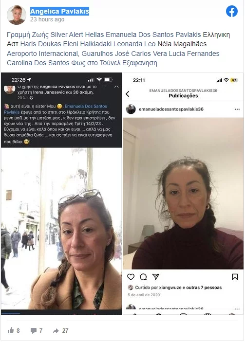 Η εξαφάνισή της 45χρονης ελληνοβραζιλιάνας Εμμανουέλας Παυλάκη, που εργάζεται στο χώρο του τουρισμού, δηλώθηκε από την αδελφή της, Αντζέλικα, την περασμένη Παρασκευή, ενώ το τελευταίο σημάδι που έχει καταγραφεί από το κινητό της, ήταν την περασμένη Τετάρτη στην Αθήνα.