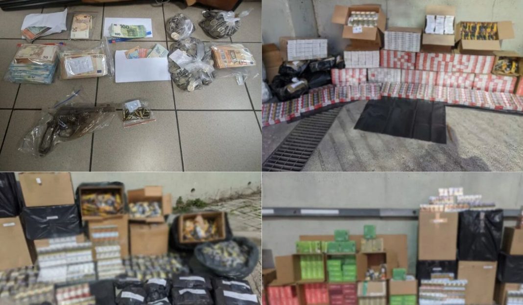 Από τις έρευνες στα σπίτια των εμπλεκομένων, αποθήκες και καταστήματα, κατασχέθηκαν, μεταξύ άλλων 201.600 τεμάχια λαθραίων τσιγάρων, 61 κιλά λαθραίου καπνού, 1.251 λαθραία ηλεκτρονικά τσιγάρα μίας χρήσης, 4 Ι.Χ.Ε. αυτοκίνητα, περίστροφο και κυνηγετικό όπλο χωρίς άδεια, 23 κινητά τηλέφωνα, το χρηματικό ποσό των 44.593 ευρώ και 121 δολάρια.