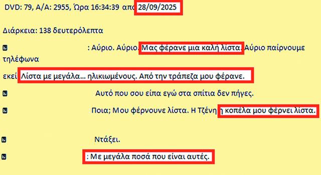 «Μας φέρανε μία καλή λίστα. Αύριο παίρνουμε τηλέφωνα εκεί. Λίστα με μεγάλα… ηλικιωμένους. Από την τράπεζα μου φέρανε. Σαράντα ονόματα. Θα σου βγάλω εγώ αύριο μεροκάματο. Και για σένα και για την κοπέλα στην τράπεζα».