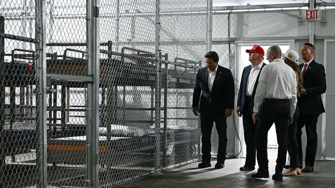 Το «Αλκατράζ με αλιγάτορες», το οποίο εγκαινίασε απόψε ο Τραμπ, είναι ένα κέντρο κράτησης μεταναστών στη μέση των Έβεργκλεϊντς. Η Φλόριντα πήρε ομοσπονδιακή έγκριση μόλις την περασμένη εβδομάδα και το κέντρο αναμένεται να ανοίξει μέσα στον μήνα με 5.000 κρεβάτια -αριθμός που αργότερα θα διπλασιαστεί. Το ετήσιο κόστος λειτουργίας, ύψους 450 εκατομμυρίων δολαρίων, θα καλυφθεί από την FEMA.