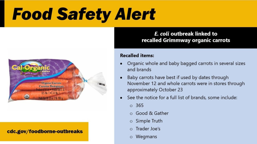 Όπως διαβάζουμε στο Axios, η Grimmway Farms στο Bakersfield της Καλιφόρνιας ανέφερε σε ανακοίνωσή της το Σάββατο ότι ανακαλεί επιλεγμένα βιολογικά καρότα και baby καρότα λόγω της επιδημίας που επηρεάζει μάρκες όπως Nature’s Promise, Wegmans και Trader Joe’s.