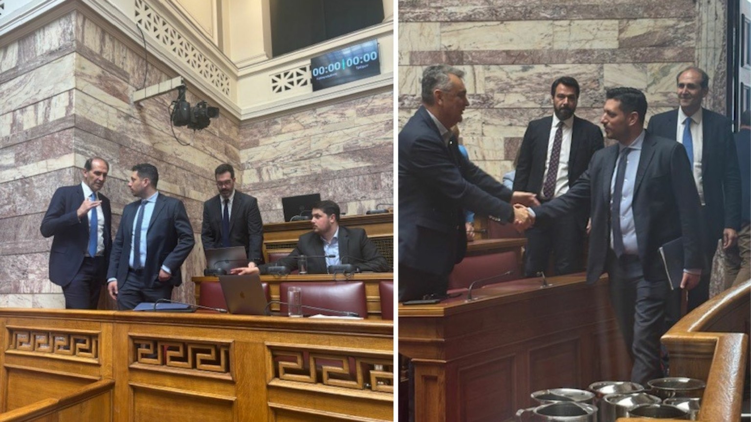 Παρούσα ήταν και η προηγούμενη ηγεσία του υπουργείου Υποδομών και Μεταφορών με τον Χρήστο Σταϊκούρα να έχει θερμή χειραψία με τον διάδοχό του.