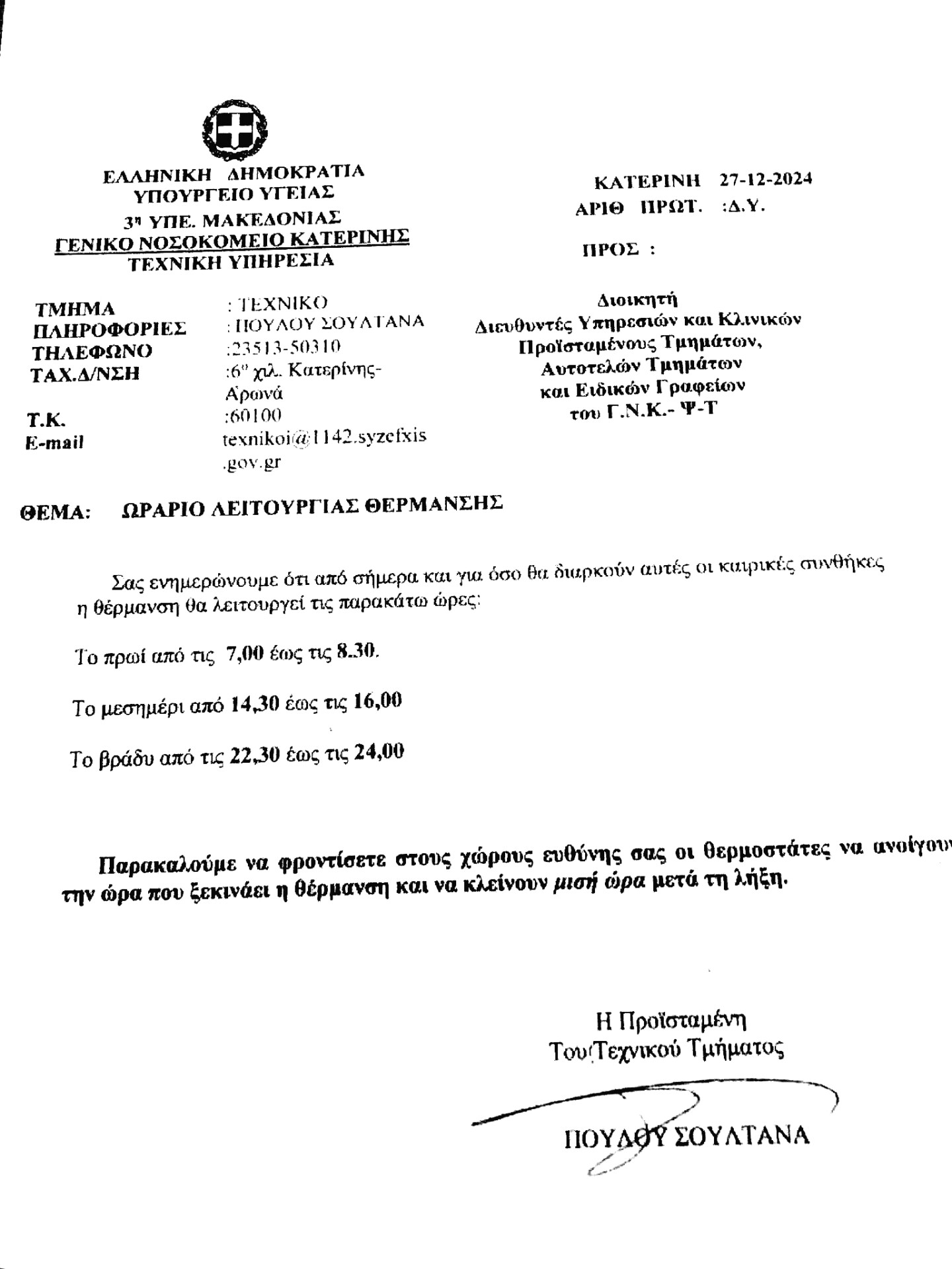 Την ώρα που ο υδράργυρος δεν ξεπερνάει τους 10 βαθμούς Κελσίου την ημέρα και πέφτει κάτω από το μηδέν τη νύχτα, η τεχνική υπηρεσία του νοσοκομείου εν μέσω των εορτών εξέδωσε ανακοίνωση με ημερομηνία 27/12/2024, με την οποία ενημερώνει τη διοίκηση, τους διευθυντές υπηρεσιών και τους προϊσταμένους των κλινικών, πως οι χώροι του νοσοκομείου θα θερμαίνονται μόνο τεσσερισήμισι ώρες το 24ωρο!
