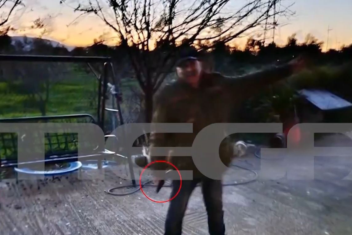 Ο Χρήστος Μαυρίκης κρατάει το όπλο στο χέρι του, δευτερόλεπτα πριν πυροβολήσει στον αέρα και σπείρει τον πανικό, έξω από το συγκρότημα κατοικιών όπου διαμένει, στα Σπάτα.