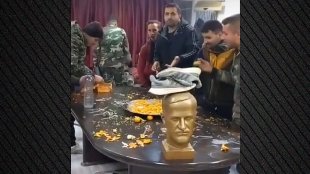 Στο επίμαχο βίντεο, που δημοσιεύτηκε στα μέσα κοινωνικής δικτύωσης, αντάρτες και πολίτες φαίνονται να κάθονται γύρω από ένα τραπέζι στην τραπεζαρία του Άσαντ, καταναλώνοντας φαγητό και γελώντας, ενώ στο τραπέζι δεσπόζει η επίχρυση προτομή του Σύρου ηγέτη, καλυμμένη «ειρωνικά» με ένα ζευγάρι αθλητικά παπούτσια μάρκας Adidas – που ενδεχομένως να βρήκαν στην γκαρνταρόμπα του Άσαντ.