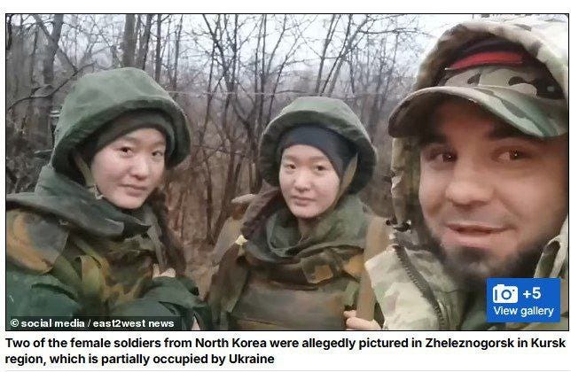 Η Daily Mail δημοσίευσε μια φωτογραφία υποστηρίζοντας ότι δείχνει δύο στρατιωτίνες της Βόρειας Κορέας στο Κουρσκ της Ρωσίας, τμήμα του οποίου έχουν καταλάβει οι δυνάμεις της Ουκρανίας ενώ διεξάγονται σφοδρές μάχες για την ανακατάληψή του από τις ρωσικές δυνάμεις (η φωτογραφική απόδειξη… της βρετανικής εφημερίδας, επάνω, με τη λεζάντα «δυο από τις στρατιωτίνες της Βόρειας Κορέας που φέρονται να φωτογραφήθηκαν στο Zheleznogorsk του Κουρσκ, τμήμα του οποίου έχει καταλάβει η Ουκρανία»).