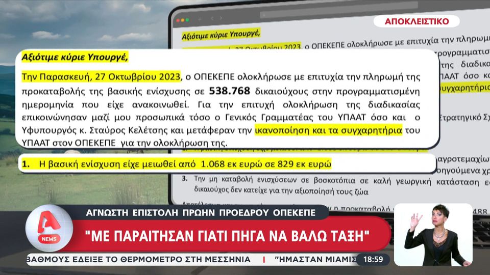 Σε νέα επιστολή του πρώην Προέδρου του ΟΠΕΚΕΠΕ Βαγγέλη Σημανδράκου που ήρθε στο φως, αποκαλύπτεται ότι τον Οκτώβριο του 2023 μείωσε κατά 169 εκατομμύρια ευρώ τις επιδοτήσεις σε σχέση με το 2022, γιατί μέσω ελέγχων που έγιναν, διαπιστώθηκε ότι 9.309 αιτούντες δικαιούχοι (ΑΦΜ) δεν πληρούσαν τα κριτήρια για επιδότηση.