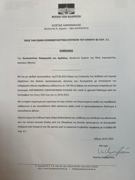 Στην κατάθεση υπομνήματος στη προανακριτική επιτροπή της Βουλής που διερευνά την τραγωδία των Τεμπών, προχώρησε όπως και αναμενόταν ο Κώστας Καραμανλής.