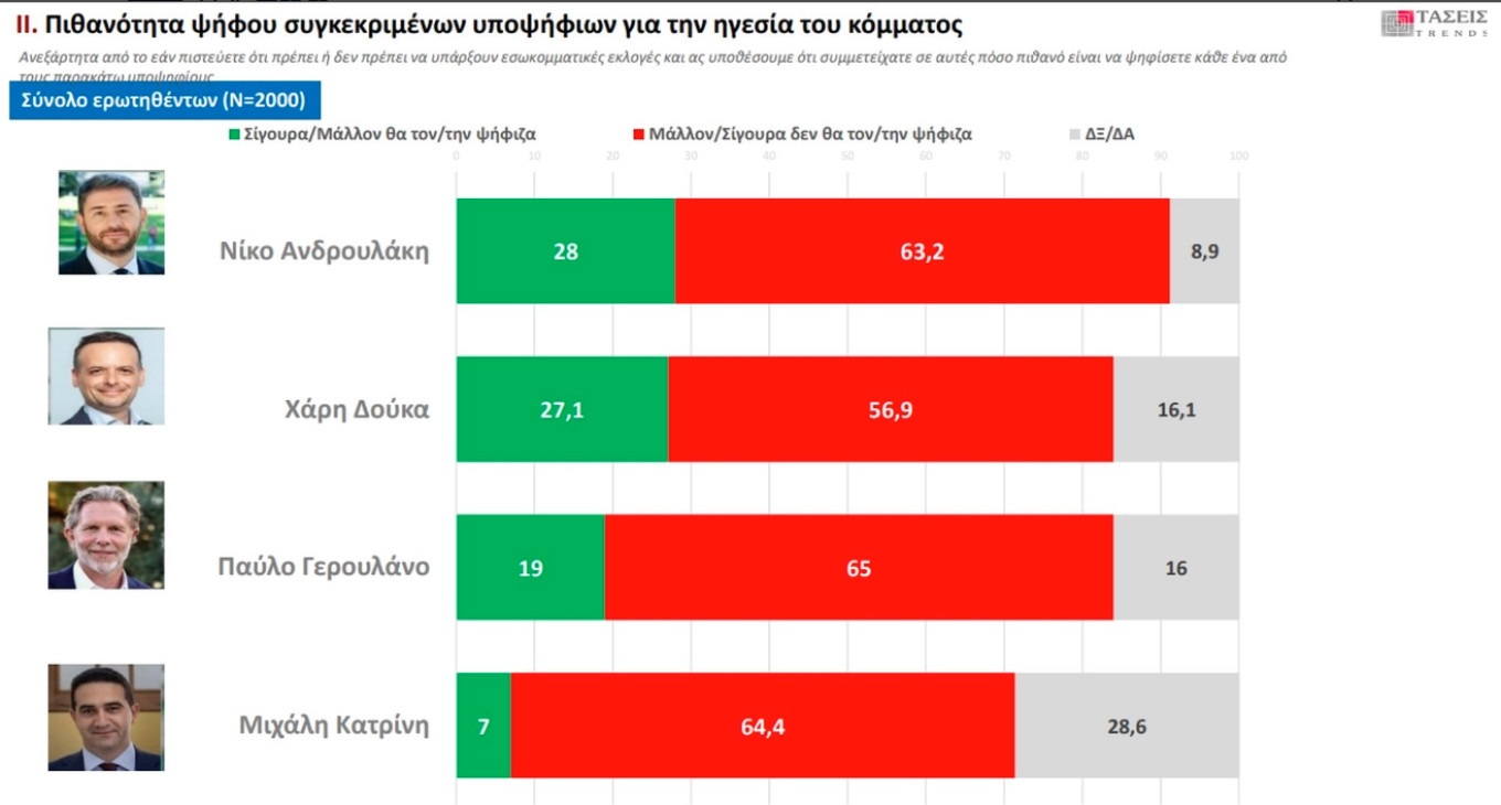 Οι εκτιμήσεις, μέχρι τώρα, κάνουν λόγο για ένα «ντέρμπι» για δύο, τους Νίκο Ανδρουλάκη και Χάρη Δούκα, κάτι που μπορεί να ανατρέψει, ωστόσο, η υποψηφιότητα του Παύλου Γερουλάνου, τον οποίο στηρίζει ανοιχτά ο Νίκος Παπανδρέου, χωρίς αυτό να σημαίνει ότι έχει εξασφαλισμένη και την ψήφο του Γιώργου Παπανδρέου, του οποίου υπήρξε στο παρελθόν στενότατος συνεργάτης.
