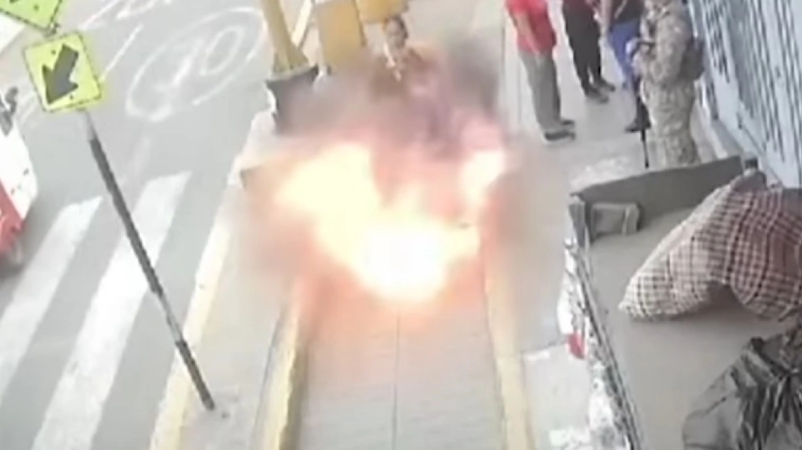 Όπως φαίνεται στο βίντεο από κάμερα ασφαλείας που κατέγραψε το περιστατικό, μετά την έκρηξη η γυναίκα έπεσε στο φρεάτιο ενώ το καπάκι του κόμβου έπεσε στο κεφάλι της.