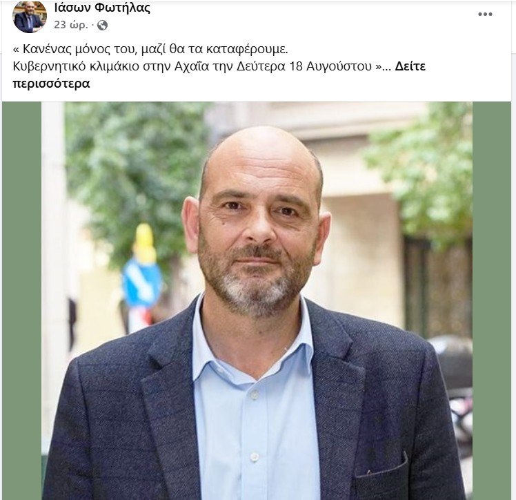 Ο βουλευτής Αχαΐας και υφυπουργός Πολιτισμού Ιάσων Φωτήλας με ανάρτησή του στα μέσα κοινωνικής δικτύωσης δίνει ραντεβού με τους πληγέντες από τη… Δευτέρα 18 Αυγούστου. Το κράξιμο που δέχεται στα σχόλια είναι επικό….