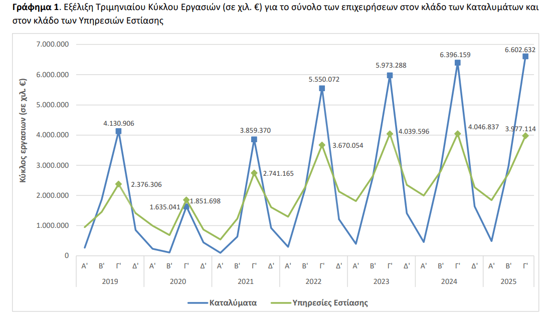 Συγκεκριμένα, το γ΄ τρίμηνο του 2025, που συμπίπτει με την κορύφωση της τουριστικής σεζόν, ο τζίρος στην εστίαση ανήλθε περίπου σε 3,9 δισ. ευρώ, από 4,04 δισ. το γ’ τριμηνο του 2024. Το β’ τρίμηνο, ο τζίρος στην εστίαση κινήθηκε στα 2,72 δισ. ευρώ από 2,80 δισ. ευρώ πέρυσι. Το α’ τρίμηνο του 2025 ο τζίρος διαμορφώθηκε σε 1,84 δισ. ευρώ από 1,99 δισ. ευρώ το 2024. Αθροιστικά οι απώλειες του τζίρου στην εστίαση στο εννεάμηνο του 2025 αγγίζουν τα 300 εκατομμύρια ευρώ.