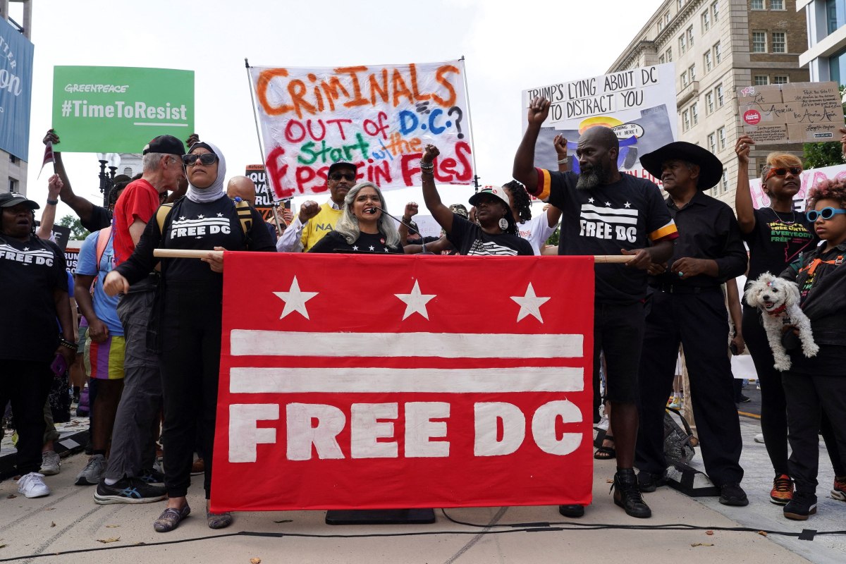 Protesters gather near the White House, as U.S. President Donald Trump announced he is placing the D.C. Metropolitan Police Department under direct federal control and deploying National Guard troops to Washington, D.C, in Washington D.C., U.S., August 11, 2025. REUTERS/Ken Cedeno