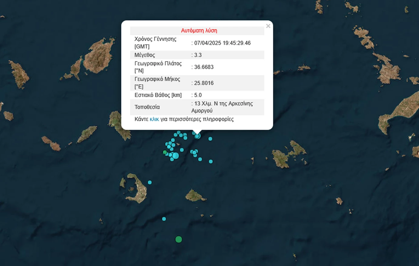 Σεισμική δόνηση μεγέθους 3,3 Ρίχτερ καταγράφηκε σήμερα (7/4) το βράδυ σε θαλάσσια περιοχή, 13 χιλιόμετρα νότια της Αρκεσίνης Αμοργού.