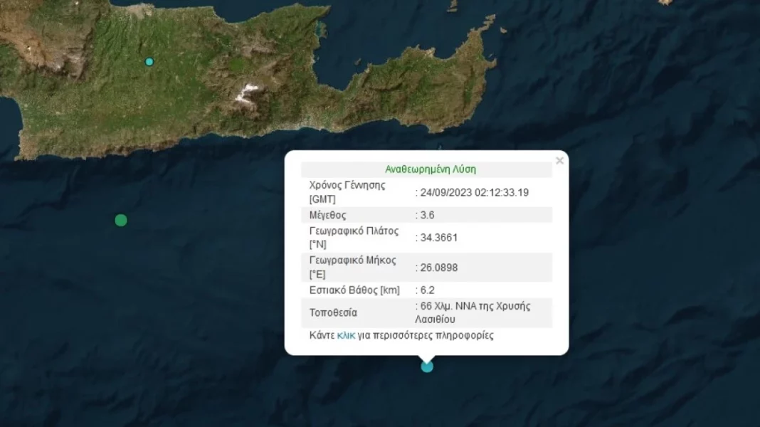 Σεισμός 3,6 Ρίχτερ σημειώθηκε τα ξημερώματα της Κυριακής, στις 05:12, στη θαλάσσια περιοχή νότια της Ιεράπετρας στην Κρήτη.