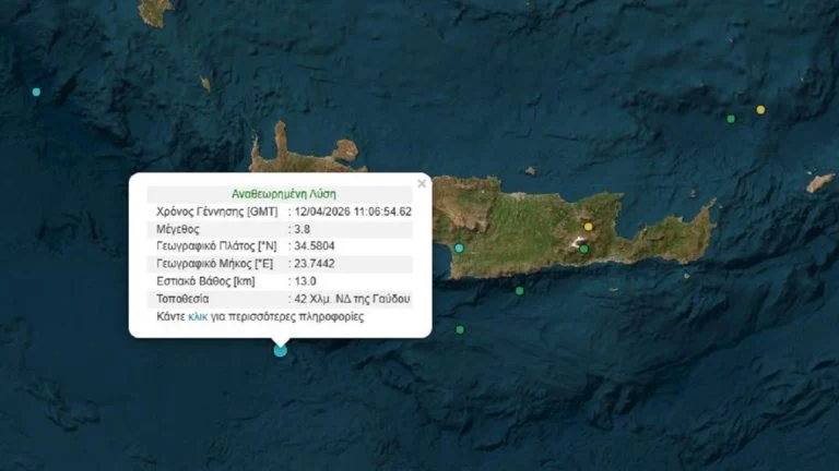 Σεισμός 3,8 βαθμών της κλίμακας Ρίχτερ σημειώθηκε πριν από λίγο στη θαλάσσια περιοχή ανοιχτά της Γαύδου.
