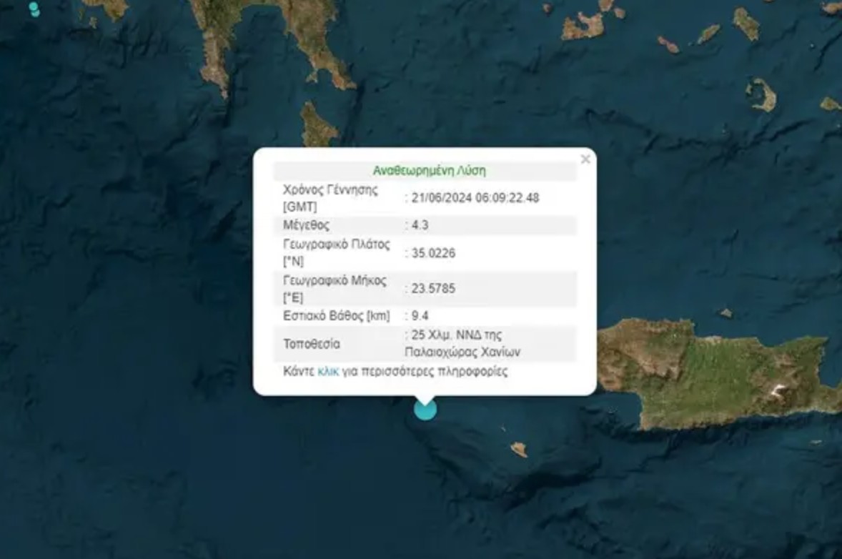 Σύμφωνα με το Γεωδυναμικό Ινστιτούτο του Εθνικού Αστεροσκοπείου Αθηνών, το επίκεντρο της δόνησης εντοπίζεται στον θαλάσσιο χώρο 25 χιλιόμετρα νότια νοτιοδυτικά της Παλαιοχώρας Χανίων.