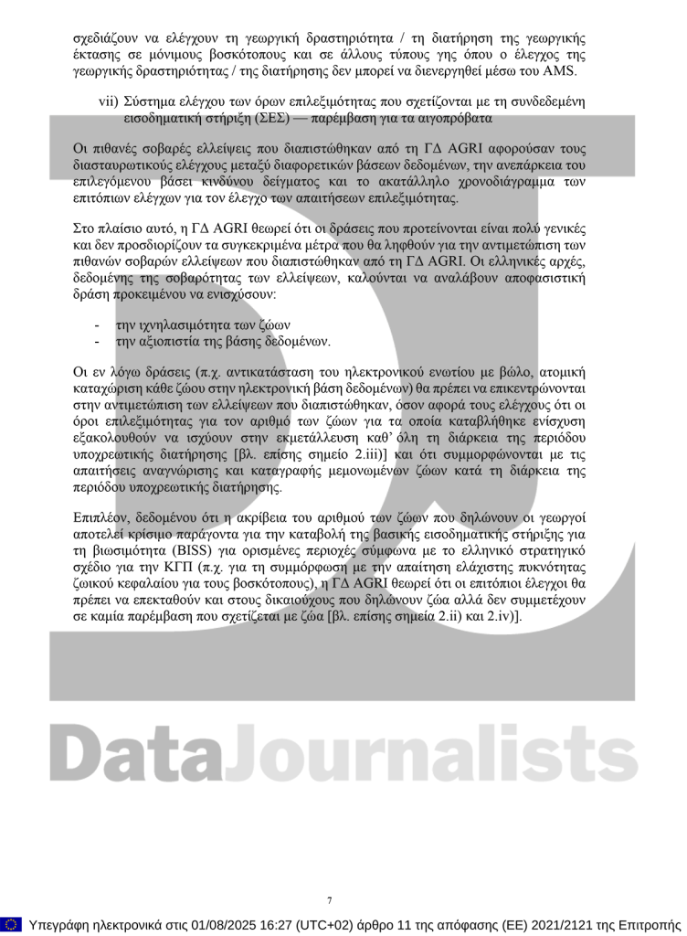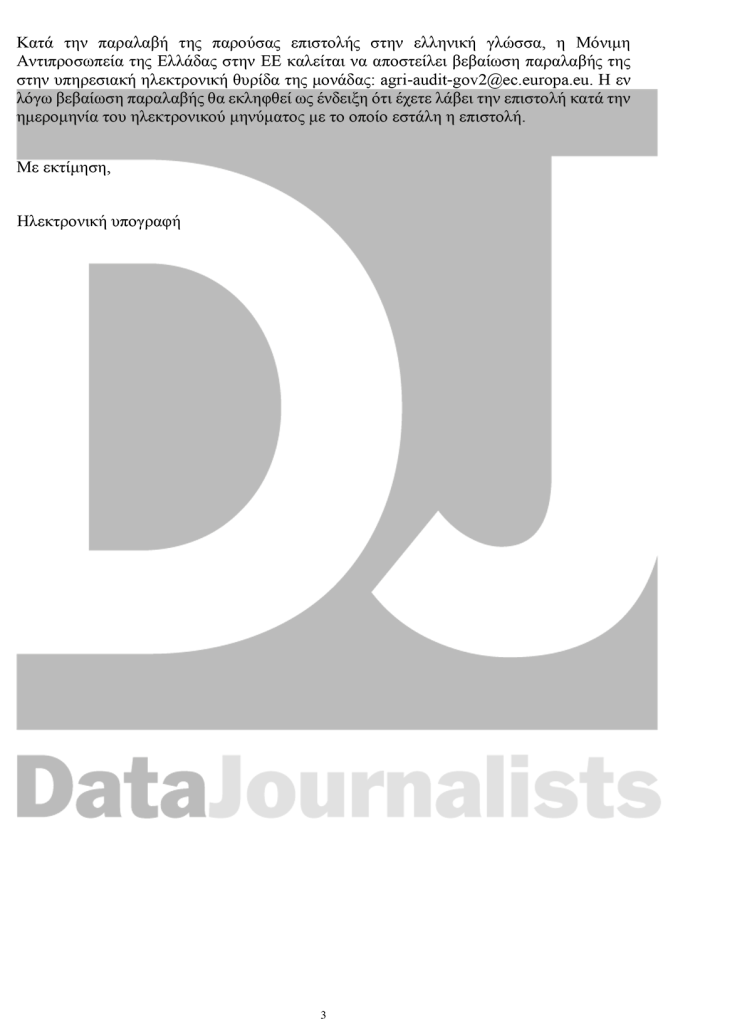 Το Μάρτιο του 2025 η Γενική Διεύθυνση Γεωργίας και Αγροτικής Ανάπτυξης της Ευρωπαϊκής Επιτροπής, απέστειλε στον ΟΠΕΚΕΠΕ και την Ειδική Γραμματεία της Επιτροπής Δημοσιονομικού Ελέγχου (ΕΔΕΛ) του υπουργείου Οικονομικών επιστολή, σε συνέχεια του ελέγχου που είχε πραγματοποιήσει το Σεπτέμβριο του 2024. Στην επιστολή, γινόταν αναφορά στα ευρήματα του ελέγχου της DG AGRI που μόνο ευνοϊκά δεν ήταν για την ελληνική πλευρά. Όπως αναφέρεται στην επιστολή που δημοσιεύουν οι Data Journalists, «ο έλεγχος συμμόρφωσης που διενεργήθηκε τον Σεπτέμβριο του 2024 από τη Γενική Διεύθυνση Γεωργίας και Αγροτικής Ανάπτυξης (ΓΔ AGRI) αποκάλυψε σειρά πιθανών σοβαρών ελλείψεων στα συστήματα διακυβέρνησης για το ΟΣΔΕ στην Ελλάδα».