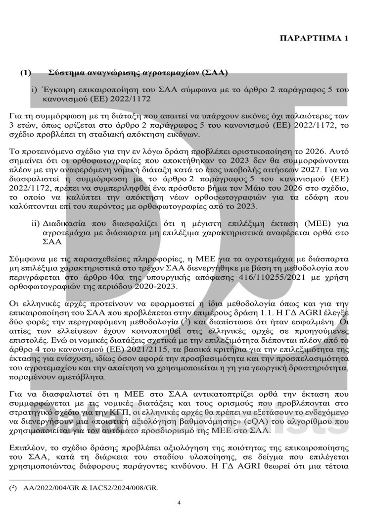 «Υπενθυμίζεται ότι, σύμφωνα με το άρθρο 42 παράγραφος 2 του κανονισμού (ΕΕ) αριθ. 2116/2021, εάν ένα κράτος μέλος δεν υποβάλει σχέδιο δράσης που αναφέρεται στην παράγραφο 1 του εν λόγω άρθρου, η Επιτροπή ενδέχεται να εκδώσει εκτελεστικές πράξεις για την αναστολή των μηνιαίων πληρωμών που αναφέρονται στο άρθρο 21 παράγραφος 3 ή των ενδιάμεσων πληρωμών που αναφέρονται στο άρθρο 32 του ίδιου κανονισμού»  τονίζεται χαρακτηριστικά στην επιστολή.