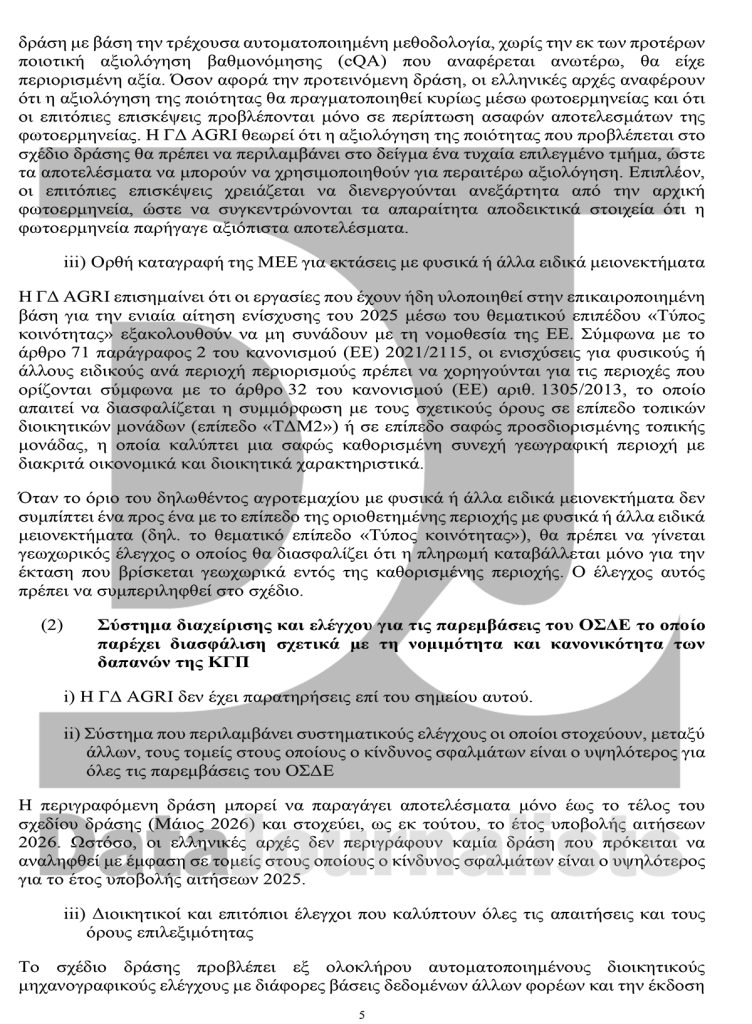 «Εάν επιβεβαιωθούν και δεν διορθωθούν για τα έτη υποβολής αιτήσεων 2025 και εξής, οι ελλείψεις αυτές θα θεωρηθούν σοβαρές κατά την έννοια του άρθρου 2 στοιχείο δ) του κανονισμού (ΕΕ) 2021/2116. Ορισμένες από τις εν λόγω ελλείψεις έχουν ήδη εντοπιστεί κατά την προηγούμενη περίοδο της ΚΓΠ· συνεπώς, είναι επαναλαμβανόμενες, πράγμα που, σε συνδυασμό με τη σοβαρότητά τους, υποδηλώνει την ύπαρξη σοβαρού προβλήματος το οποίο επηρεάζει τη βεβαιότητα που μπορεί να αποκομίσει η ΓΔ AGRI όσον αφορά την επιλεξιμότητα των τρεχουσών και μελλοντικών δαπανών της ΚΓΠ που υπόκεινται στο ΟΣΔΕ» επισημαίνεται στην επιστολή.