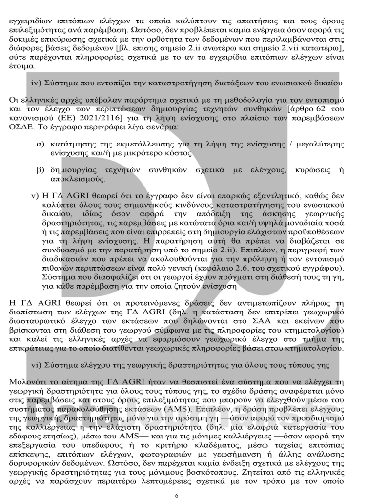 «Μετά από ανάλυση του σχεδίου δράσης και των συμπληρωματικών πληροφοριών που παρασχέθηκαν από τις ελληνικές αρχές στην επιστολή σας της 2ας Ιουνίου 2025, η ΓΔ AGRI είναι της άποψης ότι το σχέδιο, όπως προτείνεται επί του παρόντος, δεν επαρκεί για την αποκατάσταση των ελλείψεων και, ως εκ τούτου, δεν συμμορφώνεται με τις διατάξεις του άρθρου 29 παράγραφος 1 του κανονισμού (ΕΕ) 2022/129» αναφέρεται στην επιστολή της DG AGRI. Παράλληλα, η Κομισιόν χτυπούσε για ακόμη μια φορά «καμπανάκι» για πιθανή αναστολή πληρωμών.