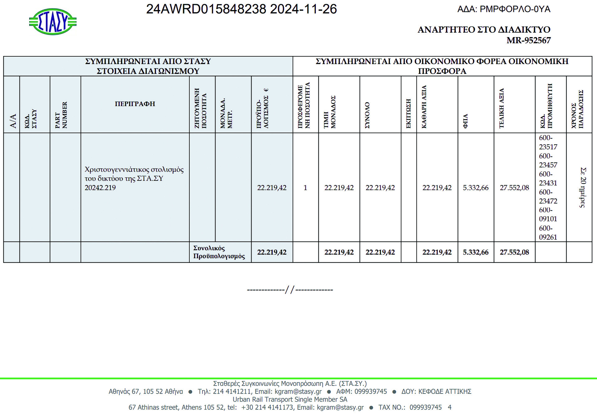 2. Την επόμενη μέρα, 27 Νοεμβρίου, η ΣΤΑ.ΣΥ. αναρτά «πρόσκληση υποβολής προσφοράς για υπηρεσίες τοποθέτησης – αποξήλωσης και μεταφοράς σε αποθηκευτικό χώρο του εορταστικού στολισμού του δικτύου της ΣΤΑ.ΣΥ». Αποδέκτης είναι μια εταιρεία του Βόλου (Καλαμπόκας Κωνσταντίνος και ΣΙΑ ΟΕ). Η προϋπολογιζόμενη δαπάνη ανέρχεται σε 18.100 ευρώ, συμπεριλαμβανομένου ΦΠΑ, μεταξύ άλλων για «τοποθέτηση ενός χριστουγεννιάτικου δέντρου με λαμπάκια ύψους 1,40μ.» στο Σύνταγμα, «τοποθέτηση επιδαπέδιου φωτιζόμενου 3D καραβιού διαστάσεων 350cmx400cm» στον Πειραιά και «τοποθέτηση διακοσμητικής γιρλάντας κομήτη στον τερματικό σταθμό Κηφισιά (ΗΣΑΠ)» κ.ά.