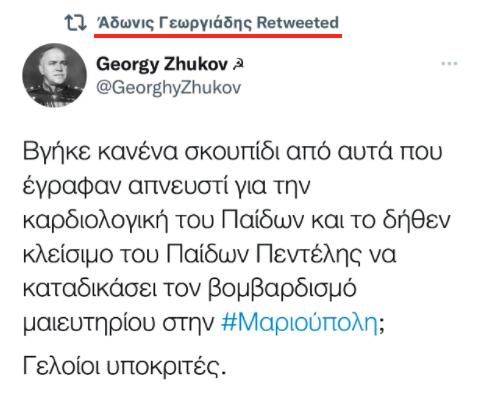 Συγκεκριμένα, η ανάρτηση που αναδημοσίευσε ο Άδωνις Γεωργιάδης, έγραφε: «Βγήκε κανένα σκουπίδι από αυτά που έγραφαν απνευστί για την καρδιολογική του Παίδων και το δήθεν κλείσιμο του Παίδων Πεντέλης να καταδικάσει τον βομβαρδισμό μαιευτηρίου στην Μαριούπολη; Γελοίοι υποκριτές».