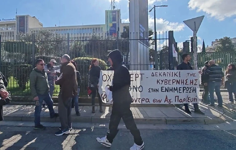 Συγκέντρωση έξω από το ραδιομέγαρο της ΕΡΤ πραγματοποίησαν σωματεία εργαζομένων στη Δημόσια Ραδιοτηλεόραση εκφράζοντας τη διαμαρτυρία τους για τον τρόπο με τον οποίο καλύφθηκαν οι κινητοποιήσεις για τα Τέμπη.