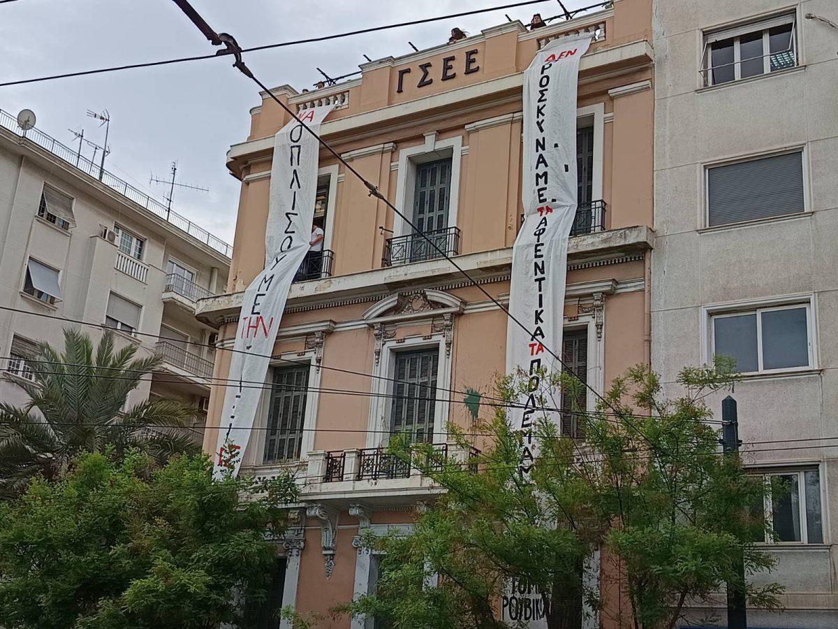 Μέλη του Ρουβίκωνα κρέμασαν δύο μεγάλα πανό την ταράτσα του κτιρίου