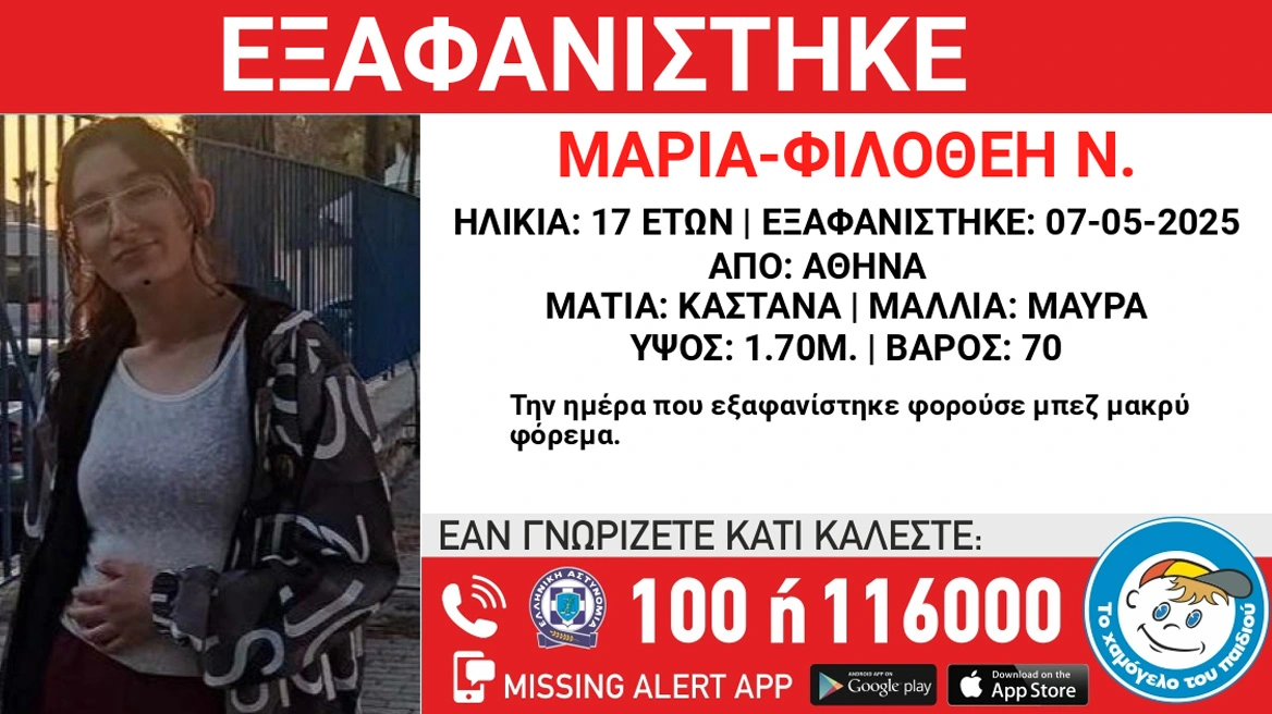 Η Μαρία – Φιλοθέη, Ν., 17 ετών, έχει ύψος 1,70 μ., βάρος 70 κιλά, έχει μαύρα μαλλιά και καστανά μάτια. Την ημέρα που εξαφανίστηκε φορούσε μπεζ μακρύ φόρεμα.