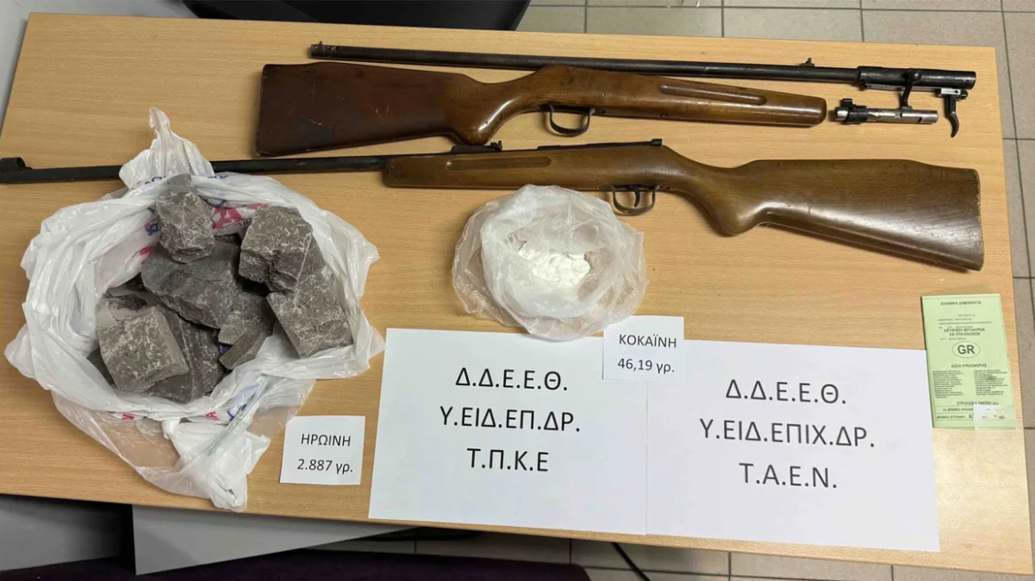 Ακολούθησε έρευνα στο σπίτι του, όπου εντοπίστηκαν επιπλέον ποσότητα κοκαΐνης (46,19 γραμμάρια) και δύο κυνηγετικά όπλα