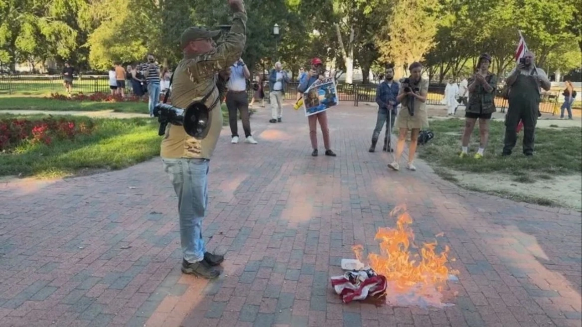 «Καίω αυτή τη σημαία σε ένδειξη διαμαρτυρίας εναντίον αυτού του παράνομου φασίστα προέδρου που έχει έδρα αυτό το οίκημα», είπε χρησιμοποιώντας τηλεβόα διαδηλωτής σε μικρό πάρκο όχι μακριά από τον Λευκό Οίκο, σύμφωνα με βίντεο που αναμεταδόθηκε μέσω ιστότοπων κοινωνικής δικτύωσης και μετέδωσαν επίσης αμερικανικά ΜΜΕ.