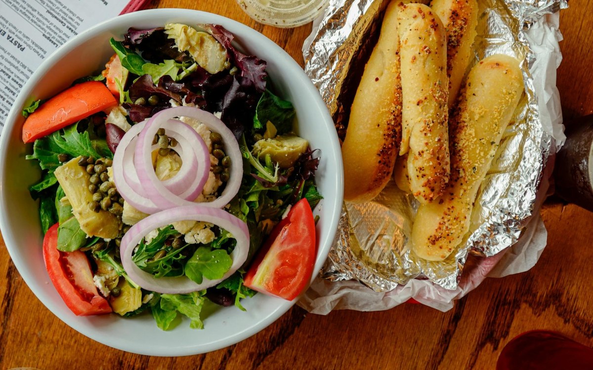 Καθαρίζουμε, πλένουμε και στεγνώνουμε καλά τη ρόκα και το σπανάκι. Κόβουμε τα ντοματίνια στη μέση και τις αγκινάρες στα δύο ή στα τέσσερα – αν δεν βρούμε φρέσκες αγκινάρες, οι μαριναρισμένες σε βάζο (σε άλμη ή λάδι) είναι εξαιρετική επιλογή.