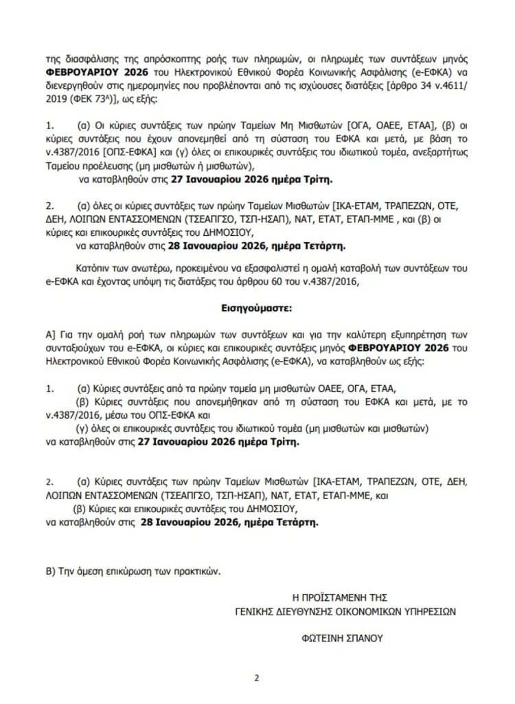 Συγκεκριμένα, αλλάζει η δεύτερη ημερομηνία πληρωμής, καθώς οι συντάξεις Φεβρουαρίου 2026 για τους συνταξιούχους σε ΙΚΑ, ΝΑΤ και Δημοσίου θα γίνει στις 28 Ιανουαρίου και όχι στις 29 του μηνός.