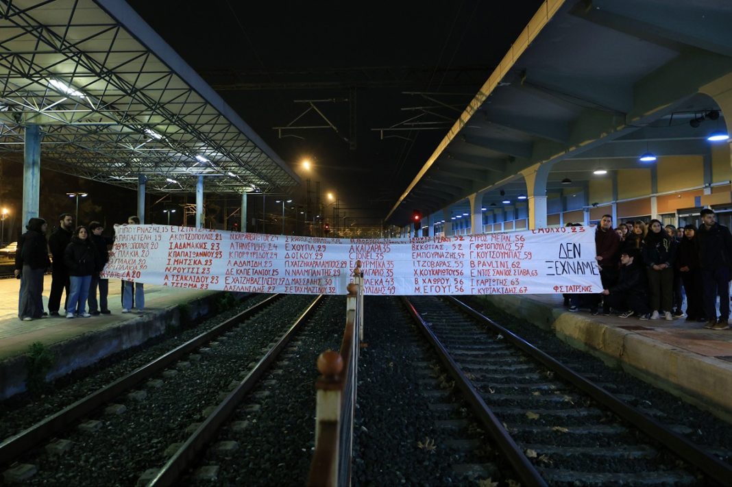 Τις σιδηροδρομικές γραμμές μπροστά από τον σταθμό του ΟΣΕ απέκλεισαν για 57 λεπτά φοιτητές του τμήματος Ιατρικής του Πανεπιστημίου Θεσσαλίας, σε μια πράξη μνήμης για τα θύματα των Τεμπών.