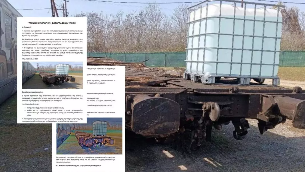 Σύμφωνα με την τεχνική αξιολόγηση, στη φωτογραφία που λήφθηκε στη θέση Κουλούρι Λάρισας, εντοπίζεται ένα δοχείο τύπου IBC (Intermediate Bulk Container) τοποθετημένο πάνω σε πλατφόρμα, η οποία πιθανολογείται ότι ανήκει στο βαγόνι Νο 4 της εμπορικής αμαξοστοιχίας.