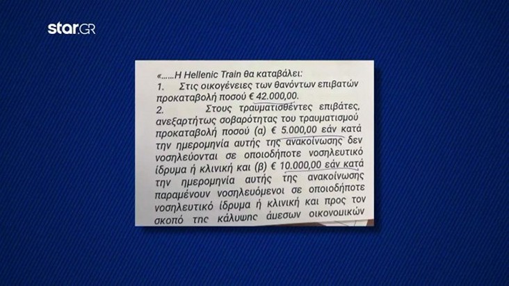 Το επίμαχο έγγραφο, αφού αναφέρει τα ποσά της προκαταβολής στη συνέχεια ξεκαθαρίζει ότι «η εν λόγω προκαταβολή δε συνιστά σε καμία περίπτωση αναγνώριση τυχόν ευθύνης της σιδηροδρομικής επιχείρησης και μπορεί να αντισταθμιστεί με οποιοδήποτε άλλο ποσό τυχόν καταβληθεί».