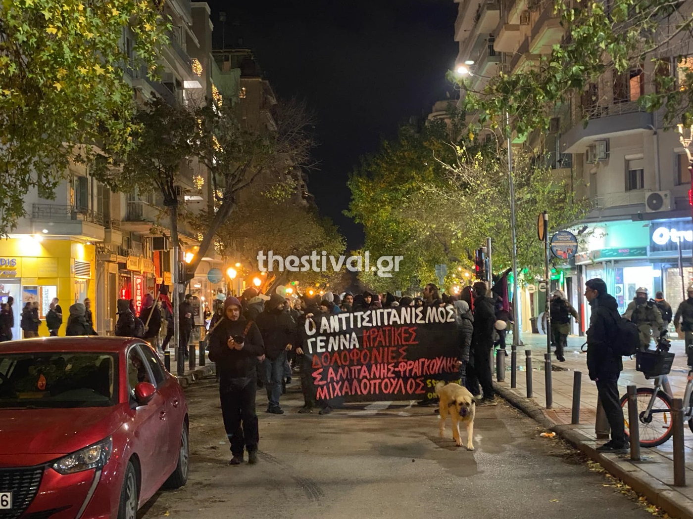 Κρατώντας πανό και φωνάζοντας συνθήματα κατά της Ελληνικής Αστυνομίας και του κράτους οι διαδηλωτές ζητούν -όπως λένε- να αποδοθεί δικαιοσύνη και αντιδρούν στο γεγονός ότι ο αστυνομικός που πυροβόλησε τον 16χρονο είναι εκτός φυλακής.