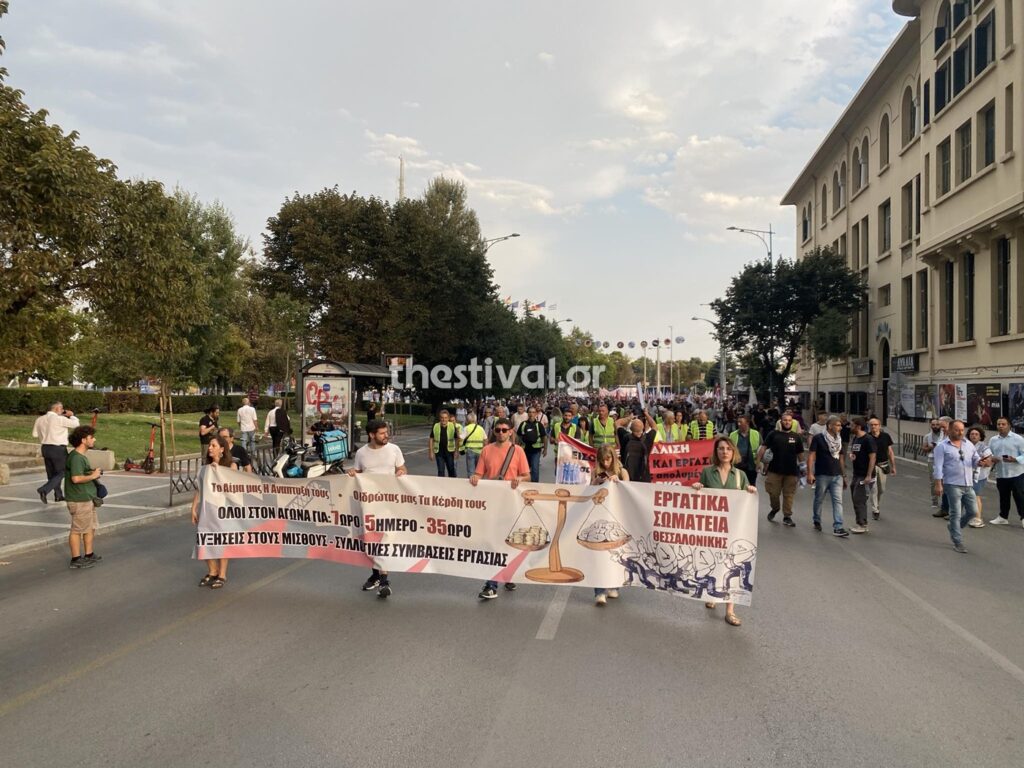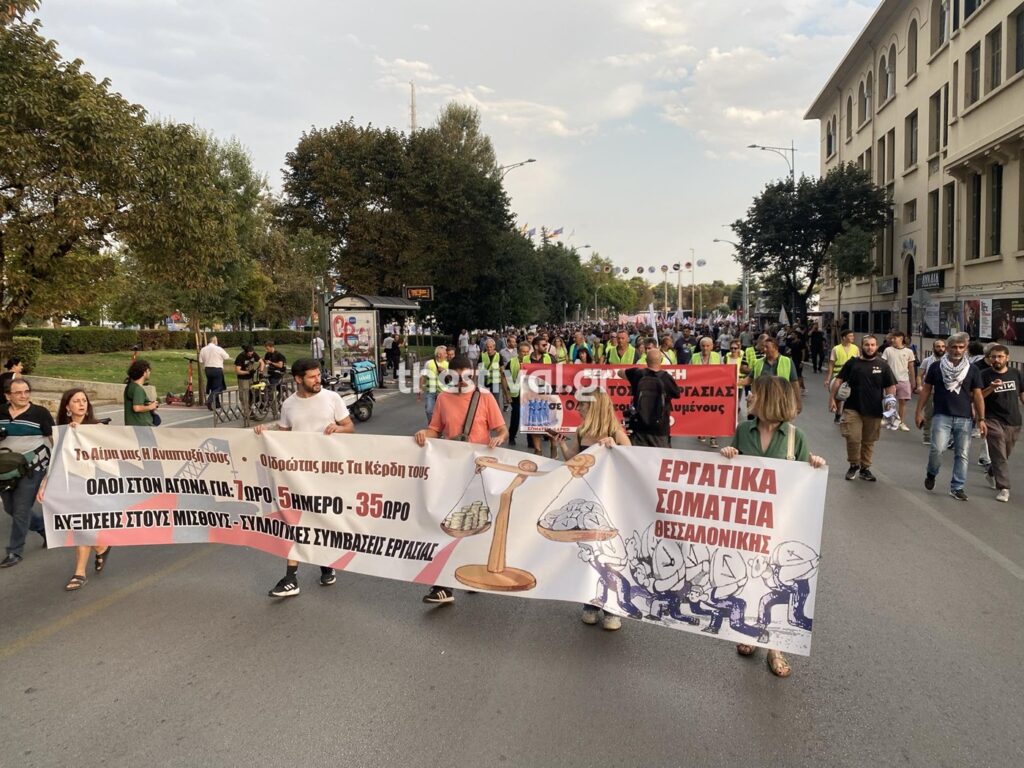Στο συλλαλητήριο συμμετέχουν εργατικά σωματεία, συνδικάτα, φοιτητικοί σύλλογοι, αυτοαπασχολούμενοι, εμποροϋπάλληλοι, σωματεία της ΛΑΡΚΟ αλλά και μέλη της ΕΔΥΕΘ. Του κυρίου όγκου των διαδηλωτών που συμμετέχουν στο συλλαλητήριο προηγούνται διανομείς με τις μηχανές τους και ομάδα διαδηλωτών που κρατούν την παλαιστινιακή σημαία.