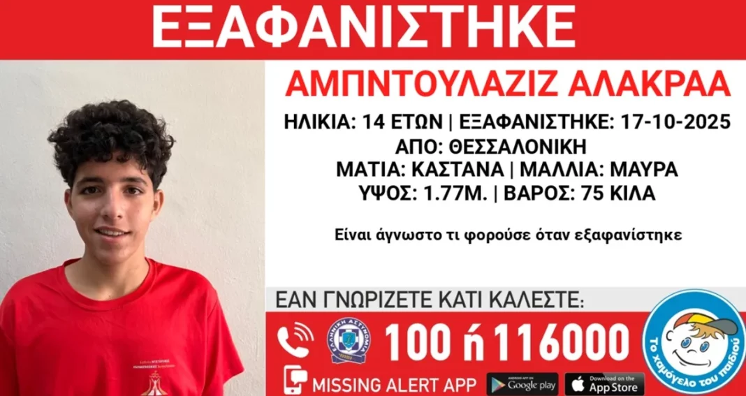 Το «Χαμόγελο του Παιδιού» ενημερώθηκε σήμερα, 18/10/2025, για την εξαφάνισή του και προχώρησε άμεσα στη δημοσιοποίηση των στοιχείων του, καθώς ενδέχεται να συντρέχουν λόγοι που θέτουν τη ζωή του σε κίνδυνο.