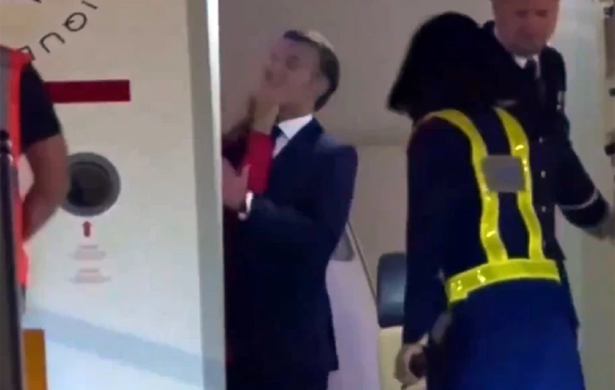 Σύμφωνα με το βίντεο, καθώς ανοίγει η πόρτα του Airbus A330, ο πρόεδρος εμφανίζεται και κάνει ένα απότομο βήμα προς τα πίσω, καθώς ένα χέρι, που φέρεται να είναι της ντυμένης στα κόκκινα συζύγου του, τον χτυπάει στο πρόσωπο. Ο Μακρόν αντιλαμβάνεται αμέσως ότι καταγράφεται από τις κάμερες, χαμογελά και χαιρετά βιαστικά.