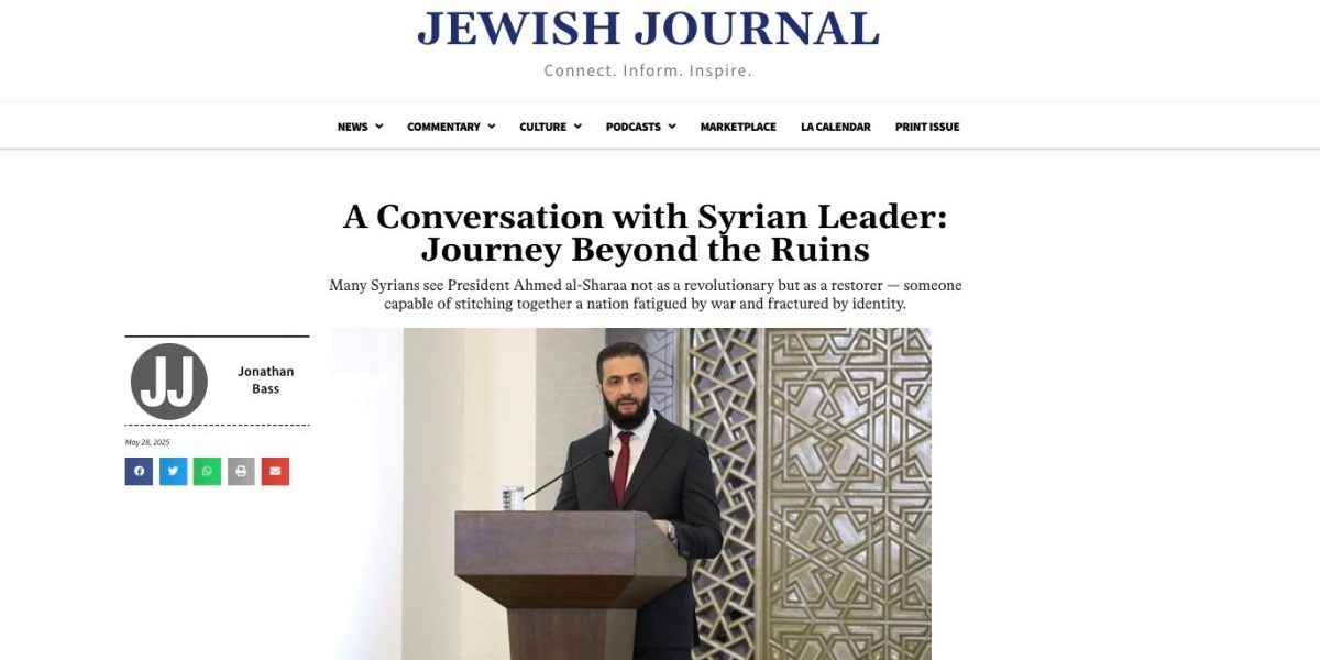 Εντάξει τα σούρτα φέρτα των Ευρωπαίων και των Αμερικάνων, καθώς και η άρση του εμπάργκο που είχε επιβληθεί στη Συρία επί Ασσαντ, αλλά να φιλοξενήσει ύμνο στο πρόσωπο του – μέχρι πρότινος ευρισκόμενου στη μαύρη λίστα της διεθνούς τρομοκρατίας – Τζολάνι, και να του κάνει συνέντευξη το μεγαλύτερο ειδησεογραφικό Μέσον Ενημέρωσης των Ισραηλιτών στις ΗΠΑ, jewish journal; Αυτό ξεπερνάει τα όρια του … στεγνού ξεπλύματος.