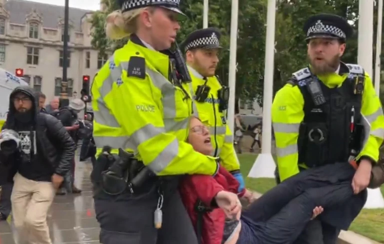 Το πλήθος που είχε συγκεντρωθεί στην Πλατεία του Κοινοβουλίου στο Λονδίνο, κοντά στο Γουεστμίνστερ, κρατούσε πλακάτ με συνθήματα υπέρ της Palestine Action, ανέφερε η αστυνομία.