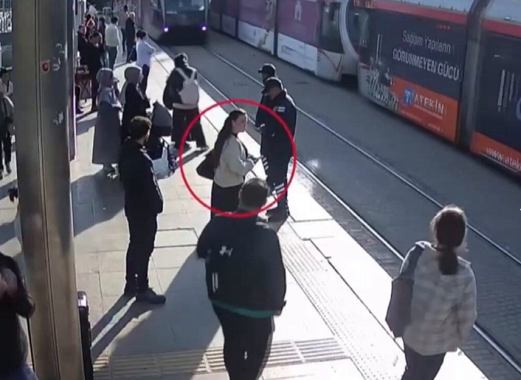 Την κρίσιμη στιγμή που η τραγωδία φαίνεται αναπόφευκτη, ένας άγρυπνος φύλακας ασφαλείας επεμβαίνει σωτήρια. Με αστραπιαία αντανακλαστικά, την αρπάζει δυναμικά από το χέρι και την τραβάει προς τα πίσω, μακριά από τις γραμμές. Ο οδηγός του τραμ, που έχει ήδη ενεργοποιήσει τα φρένα, καταφέρνει να σταματήσει το όχημα λίγα μέτρα αργότερα.