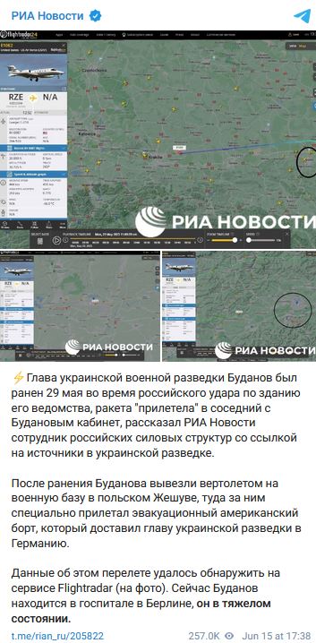 Σύμφωνα με πληροφορίες που έλαβαν οι ρωσικές δυνάμεις ασφαλείας από πηγές στην Κύρια Διεύθυνση Πληροφοριών της Ουκρανίας, έγινε γνωστό ότι ο Kirill Budanov τραυματίστηκε κατά τη διάρκεια ρωσικής επίθεσης το πρωί της 29ης Μαΐου στο κτίριο της κύριας διεύθυνσης πληροφοριών που βρίσκεται στο νησί Rybalsky.