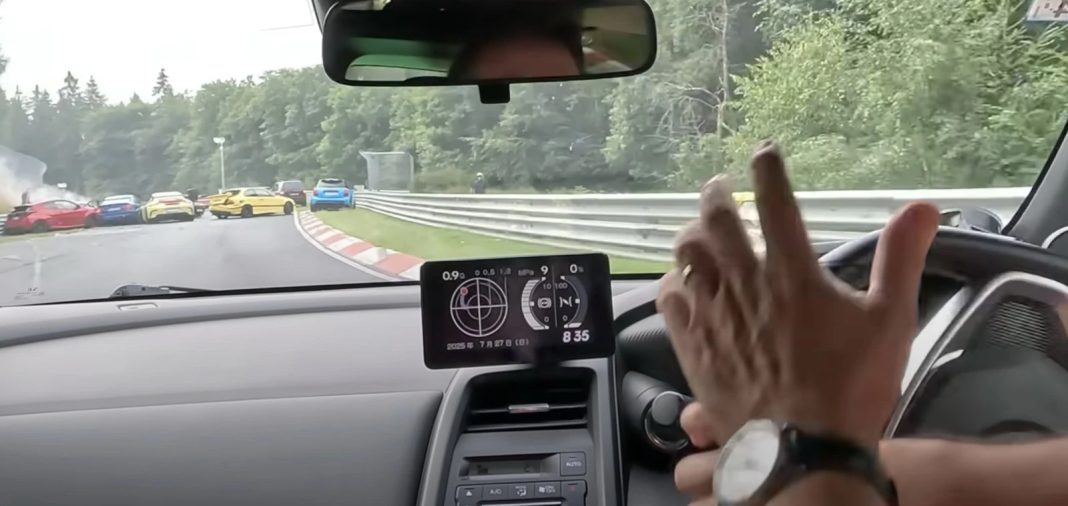 Χαρακτηριστικό βίντεο από οδηγό Honda S660 που κατέγραψε το συμβάν, δείχνει την απίστευτη στιγμή της προσέγγισής του στη στροφή χωρίς καμία προειδοποίηση. Εμπρός του, αυτοκίνητα -ανάμεσά τους μια Porsche, μια Toyota και αρκετές BMW- είναι διαλυμένα και σταματημένα επάνω στην αγωνιστική γραμμή. Με την ταχύτητα ήδη υψηλή και τον ορίζοντα μπλοκαρισμένο, δεν υπάρχει περιθώριο αντίδρασης.